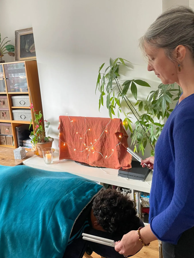 You will be lying on a massage table, fully clothed. Once you are comfortable, you will receive sounds from my voice and tuning forks, sometimes directed at certain areas of your body where energy seems stuck and sometimes directed to the whole body.